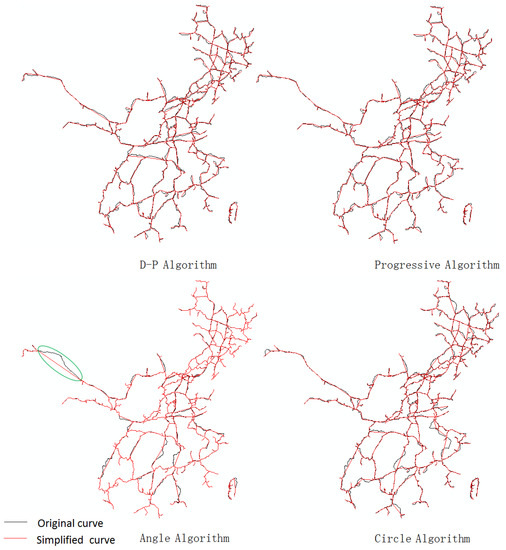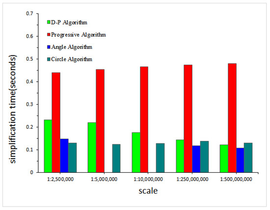 Figure 10 shows the result of the simplification time for the four algorithms. Obviously, the Progressive algorithm takes longer time. The simplification time of the D-P algorithm experiences some minor change with different map scales. The Angle algorithm and Circle algorithm require similar simplification times, and the simplification time of these algorithms are shortest among the four algorithms. In addition, the simplification times of the Angle algorithm and Circle algorithm vary only a little with different map scales.