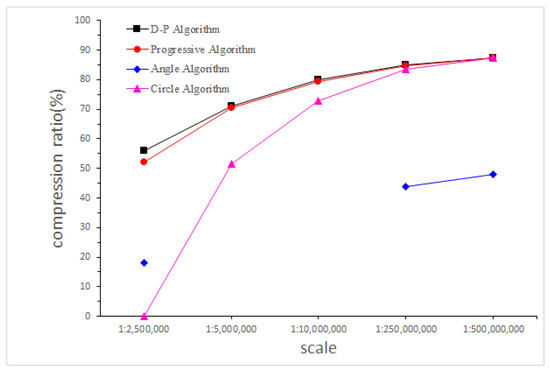 The compression ratio of the four simplification algorithms is shown in Figure 9. The compression ratio goes up as the map scale gets smaller. The D-P algorithm and Progressive algorithm have the same capability in compression ratio. Also, they are better than the other two algorithms, with up to approximately 55% to 85% higher compression ratios. Figure 9 also shows that the Circle algorithm is low in compression ratio when the map scale is 1:2.5 M, and the Angle algorithm does not have a high compression ratio regardless of the map scale.