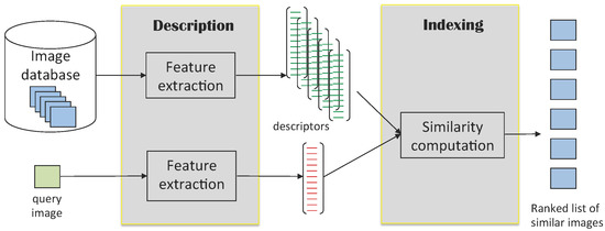 A standard CBIR system is composed by at least two components: its content description or feature extraction module, which reduces the visual data into compact representations, and the similarity measure which will be used on the extracted features in order to determine the images similar to the query (cf. Figure 1).