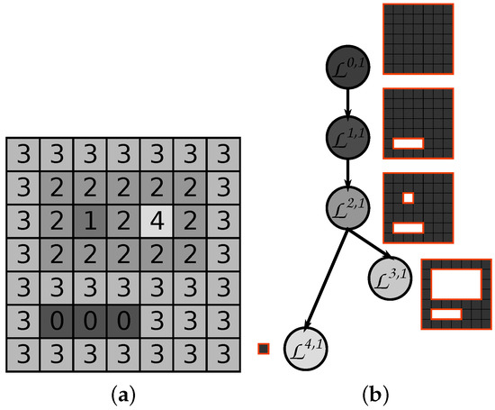 The min- and max-trees [51,52] are hierarchical decompositions of an image, working with its level sets. In more detail, the upper level sets are defined for each gray level k of an image I. The upper level set at level k comprises all the pixels p with the gray level value higher than the threshold k, . Each level set can contain several connected components, called also the peak components. The peak components of the upper level set are denoted by (where i is from some index set) and are nested for the decreasing values of k. When organized in a hierarchy, these nested components form a hierarchy called a max-tree (cf. Figure 2) which contains a node corresponding to each peak component .