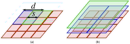 The illustration of how the patches cover the densely sampled image. In (a), the coverage on a single scale is shown. The patch dimensions are , and the parameter s determines the offset between the centers of the patches; in (b), three final layers in a pyramid of patches covering the image are shown (no overlap between the patches is shown in this example for clarity).