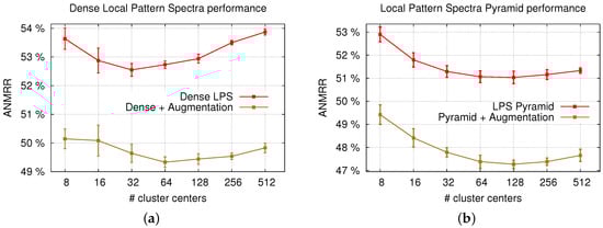 However, the LPS results are reported using only the CNC attribute, since, contrary to GPS, their combination with the other shape attribute did not result in an improvement. This can be explained by the fact that the amount of detail contained in the densely sampled patches is much smaller than in the whole image as in the case of GPS, hence resulting in fewer samples (regions) employed during histogram calculation. Moreover, the range of the attribute is typically smaller than that of the CNC attribute; consequently, the histograms are no longer representative of the distribution of this attribute in LPS, due to the lack of sufficient sample regions. Data augmentation, on the other hand, leads to an improvement of three percentile points for both ANMRR and mAP (Figure 7a). This figure also shows the effect of the number of VLAD cluster centers on performance, where it can be observed that the best performance is achieved for a relatively low number of cluster centers. It can also be seen that the optimal number of cluster centers shifts towards greater values when data augmentation is applied, due to the greater variability expressed in the descriptors.