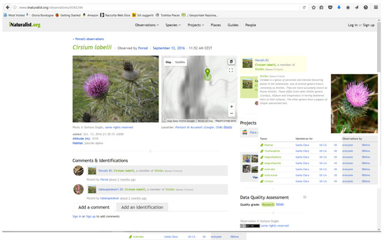 Screenshot of the inaturalist Web geoportal displaying a VGI in the form of a classified picture (on the left), its geofootprint with associated imprecision (the circle on the map) and the correspondent visual ontology item with complementary information on the species “Thistle” (on the right) [].