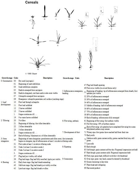 - Growth Stages of Mono and Dicotyledonous Plants. Available online: https://www.politicheagricole.it/flex/AppData/WebLive/Agrometeo/MIEPFY800/BBCHengl2001.pdf (accessed on 8 August 2016).