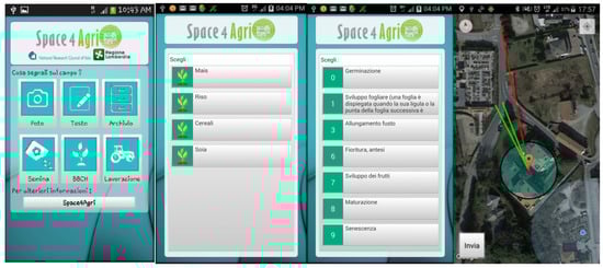 The Space4Agri (S4A) project defined and developed a Spatial Data Infrastructure (SDI) integrating multisource heterogeneous data from space, i.e., satellite images and Unmanned Aerial Vehicle (UAV) photographs, authoritative databases from Lombardy Agricultural Authority and cadastral data, and in situ data on crop development and agro-practices created by volunteer agronomists, farmers and citizens to support sustainable and precision agriculture in Lombardy region, Northern Italy []. A smart application, the S4A smart app, has been designed and implemented to create contextualized VGI by having as cornerstones the following design concepts:
