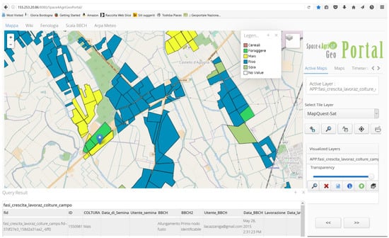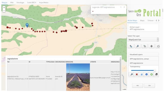 A Web GIS server deploys the VGI items stored into the geodatabase as distinct views on the Web, together with the conflation data layer and, possibly, other multisource geospatial data of interest to the project via OGC Web Services. A metadata record, based on INSPIRE and the Italian National regulation “Repertorio Nazionale dei Dati Territoriali”, is created for each type of VGI layer with basic information describing the common characteristics of its VGI items, i.e., category type, link to the URL of the used extensive BBCH ontology, common keywords to empower data discovery, and the bounding box containing all VGI geofootprints. This way the users of VGI have all extensive information on the semantic and can thus interpret correctly the meaning of VGI. To this end, the S4A geoportal allows accessing the created VGI together with other geo-data of the project. The geoportal can display the distinct views of the VGI items: as pins that one can click and open to see the enclosed pictures and free text, and as markers with distinct colors to distinguish the types of crops of the BBCH ontology described in the associated legend. One can also see distinct colors in the entities of the conflation data layer that have been tagged with a BBCH category by at least a VGI item (see Figure 4) and, finally, the map of VGI outliers not associated with any surveyed field.
