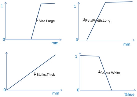 - Size.very_Large, PetalWidth.Long, Colour.White and Stalks.Thick are fuzzy predicates represented by fuzzy sets with membership functions μSize.very_Large, μPetalWidth.Long, μColour.White, and μStalks.Thick, as depicted in Figure 6.