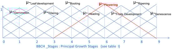 Hereafter, we will make an example relative to the definition of a fuzzy BBCH ontology describing the crop types, considered as precise concepts, and their development stages introduced in Section 3.1, that can be considered as fuzzy stages to some extent since there is a gradual transition from one development stage to the successive one with intermediate characteristics of the crop growth. Thus, it makes sense to define fuzzy BBCH values with membership functions on a continuous domain of the ordered crisp BBCH stages defined in Table 1 (see Figure 7).