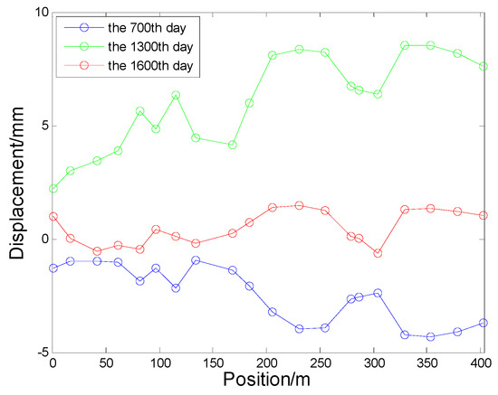 In this experiment, displacement data before 8 August 2010 were used for filtering and interpolation. Displacement data from 9–11 August 2010 were used to verify the prediction effectiveness. Similar to the simulation experiment, we used the STKF to filter the observed data firstly. Secondly, in order to check the effectiveness of spatio-temporal interpolation using STKF, we chose 19 points as observation points, and the rest point as a check point. We Repeated the process until all the points were interpolated. Thirdly, we predicted three days’ displacement of all 20 points to check the effectiveness of the spatio-temporal prediction of STKF. Lastly, the whole dam horizontal displacement in spatio-temporal domain was interpolated to view its spatio-temporal variation, and the three days of horizontal displacement prediction for the whole dam was also included. According to the flow diagram of STKF, we randomly chose data from the 700th, 1300th, and 1600th day of dam horizontal displacement in the analysis to select space trend firstly.