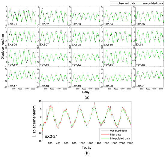 Filter and interpolated missing data results. (a) Filter and interpolated missing data results of all points; (b) Filter and interpolated missing data results of EX2_21.