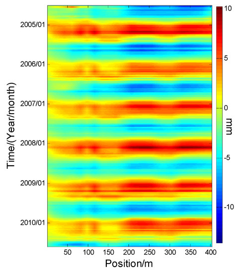In Equation (24), is the displacement, is the position of the monitoring points on the dam, is the time, and is the observation noise with a standard deviation of 0.1 mm. Suppose , for 23 points in total, and , then the horizontal displacement data series (1 day sampling rate) of 23 monitoring points have been simulated.