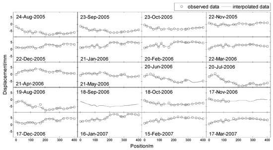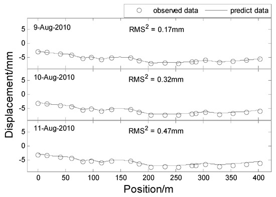 As Figure 2 shows, the interpolated values coincided with the observed values. As such, we can say that the STKF can well interpolate the point data without monitoring. As listed in Table 1, the interpolation and filter was about 0.03 mm, which had been reduced by about 70% compared with the noise whose standard deviation was 0.1 mm. The interpolation result and filter result were very close, which may be due to the fact that we used a very exact trend matrix. For the prediction result, the prediction accuracy was lower than that of filter and interpolation. Its RMS was around 0.05 mm with the maximum value of 0.091 mm, which was close to the standard deviation of 0.1 mm.