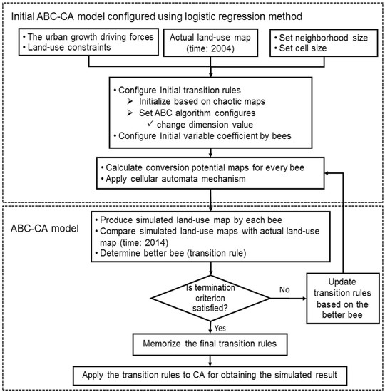As previously mentioned, spatial variables in the urban growth phenomenon have heterogeneity and nonlinearity attributes. In the first step, the involved geospatial layers are prepared based on the urban growth driving force parameters. Then, the initialization of the coefficients of the involved layers is performed by the bees with chaotic maps (initial transition rules of CA). Next, based on the CA specification and LR, the conversion potential of any pixel to change its state to an urban pixel is calculated. For every bee, a new layer is produced according to the calculated potential. By comparing the produced layers, the best bee is selected in the first iteration. Based on the selected bee, new transition rules are updated. In the next iterations, until the optimal solution is produced, the above-mentioned steps are repeated.