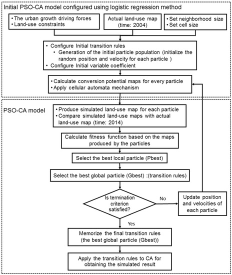 Particle swarm optimization (PSO) was introduced by Kennedy and Eberhart (1995) based on swarm intelligence and inspired by the foraging behavior of natural swarms such as birds and fish [68]. PSO is a proper algorithm for calibrating urban CA because of its abilities to obtain the optimum global pattern and reduce the simulation uncertainties. Therefore, CA can use this approach to obtain transition rules [34,49].