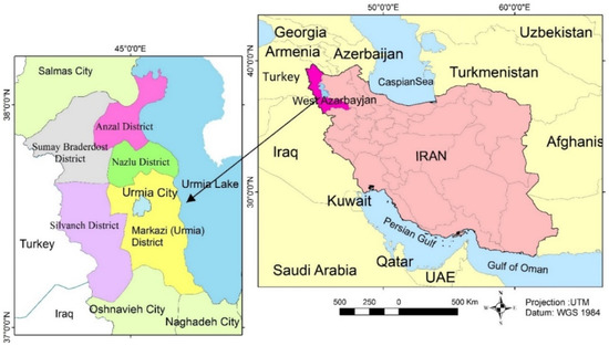 In this study, for calibrating CA, it is integrated with two SI algorithms including PSO and ABC. The models are tested using data for Urmia, Iran to simulate its future urban growth pattern. The city is located in the northwest of Iran. This study area is an important geographical region in the sense that it is located bordering Turkey and Iraq (Figure 3). This situation has led to economic growth of the region over the years. The region’s dominant economy relies on agriculture and recently some industrial activities have begun. In the past five decades, the population of Urmia has increased by more than 10 times while its area increased by about 27-fold [56]. This means that Urmia has experienced rapid urban growth.