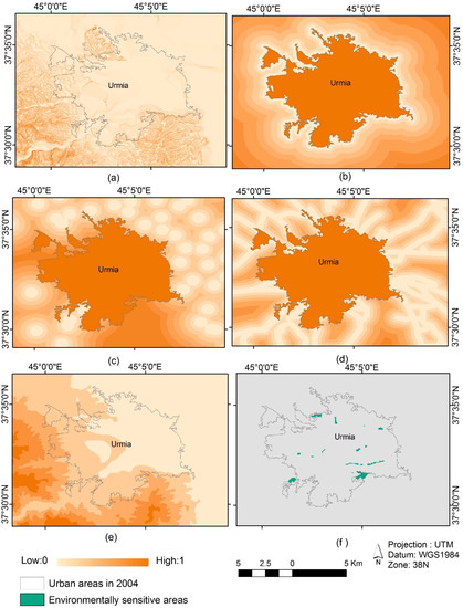 Normalized data of urban growth process in Urmia. (a) Slope map; (b) Proximity to major business center map; (c) Proximity to population center map; (d) Proximity to major roads map; (e) Elevation map; and (f) Environmentally sensitive areas map.