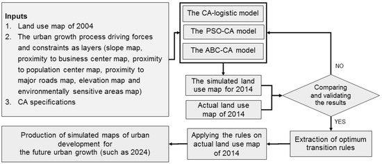 The proposed model for urban growth modeling by the ABC-CA, PSO-CA, and CA-logistic models.