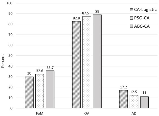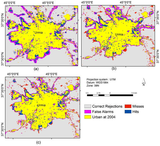 In order to evaluate our urban growth models, we compared the result of the simulations against the reference map to quantify the goodness-of-fit of the models projections [72,73]. Comparisons between the observed and the simulated changes in the ABC-CA, PSO-CA, and CA-logistic models based on the areas of observed change simulated correctly (hits), observed persistence simulated as change (false alarms), observed change simulated as persistence (misses), and observed persistence simulated as persistence (correct rejections) [73] are shown in Figure 7.