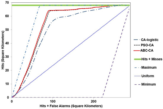 Another method that is widely used to validate urban growth and land change models is the relative operating characteristics (ROC) index proposed by Pontius and Schneider (2001) [75]. It evaluates the capability of the model in producing the best suitability maps independent of applying the threshold values to create a binary change map [75,76]. However, according to Pontius and Si (2014), several concerns exist regarding the use of ROC and the area under the curve of the ROC as an accuracy measure showing the summarization of the strength of the model [75]. The total operating characteristics (TOC) were introduced to deal with the ROC limitations. The consideration of multiple thresholds was accomplished by both ROC and TOC methods. TOC generates a graphical plot to reveal the information which shows a whole contingency table for all thresholds while ROC fails to do that. TOC shows the produced information of ROC and additional information such as the size of the number of observations (as the horizontal axis), the size of reference presence (the vertical axis), and information about the contingency table (Table 3). The contingency table presents accuracy statistics, including the total accuracy, the user accuracy, and producer accuracy. In Table 3, the main entries are hits (H), misses (M), false alarms (F), and correct rejection (CR) for a given threshold t. In the TOC plot, two boundaries as minimum and maximum exist that show the possible space of the TOC curve [75]. Figure 9 shows the TOC plots for the ABC-CA, PSO-CA and CA-logistic models. Comparing the two plots shows that the TOC curve of the ABC-CA model is closer to the maximum boundary representing the highest ranking observations of the index variable [59] rather than the TOC curve of the PSO-CA and CA-logistic models. This means that the ABC-CA model creates better results compared with those of the PSO-CA and logistic models. Table 4 shows the summary of the validation methods used in this research to evaluate the performance of the implemented models in urban growth modeling.