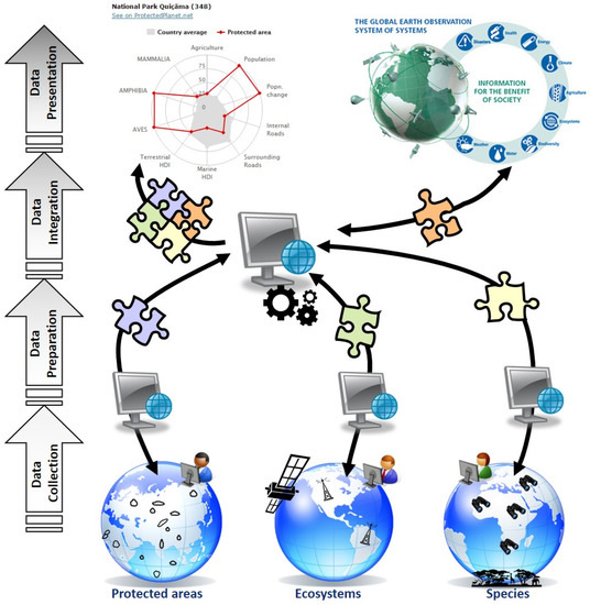 A few prototypes adopting a Service-Oriented Architecture (SOA) and distributed databases have been initially developed to demonstrate the potential of such an architecture for biodiversity [38,39] using, for example, a web-processing service for ecological modeling and forecasting [25,40]. Such a Service-Oriented Architecture (SOA) would have been stimulating as much as possible a culture of “quality control” for robust science through the whole data process: from the harvesting of the data to their integration with other sources by different experts when generating new information. A true SOA greatly eases the overall update of the selected datasets and indicators and allows developers to propose an almost infinite number of web-based tools for different end-users who thus require only access to the internet to access millions of records, run models and access the latest information that is available without any need of a local infrastructure.