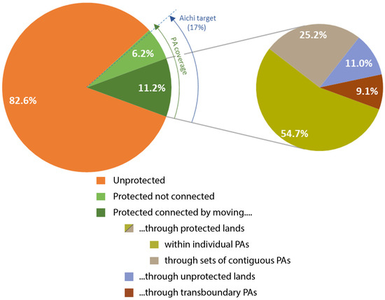 Regarding connectivity, the forthcoming release of the DOPA planned for early 2017 will include the ProtConn indicator, which (i) quantifies the percentage of a country or ecoregion covered by protected connected lands; (ii) can be partitioned in several components depicting different categories of land (unprotected, protected or transboundary) through which movement between protected locations may occur; (iii) is easy to communicate, to compare with PA coverage and to use in the assessment of global targets for PA systems (Figure 2). This connectivity indicator is presented and described in detail in Saura et al. [19].