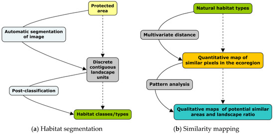 Each PA in the DOPA with a minimum size of 100 km2 is (a) segmented automatically in patches containing homogeneous habitats before (b) being each assessed in terms of probabilities to find elsewhere in the same ecoregion similar ecological conditions. See [26] for further details.