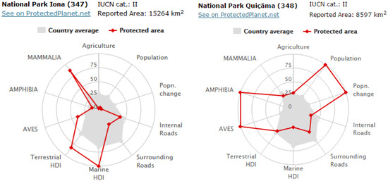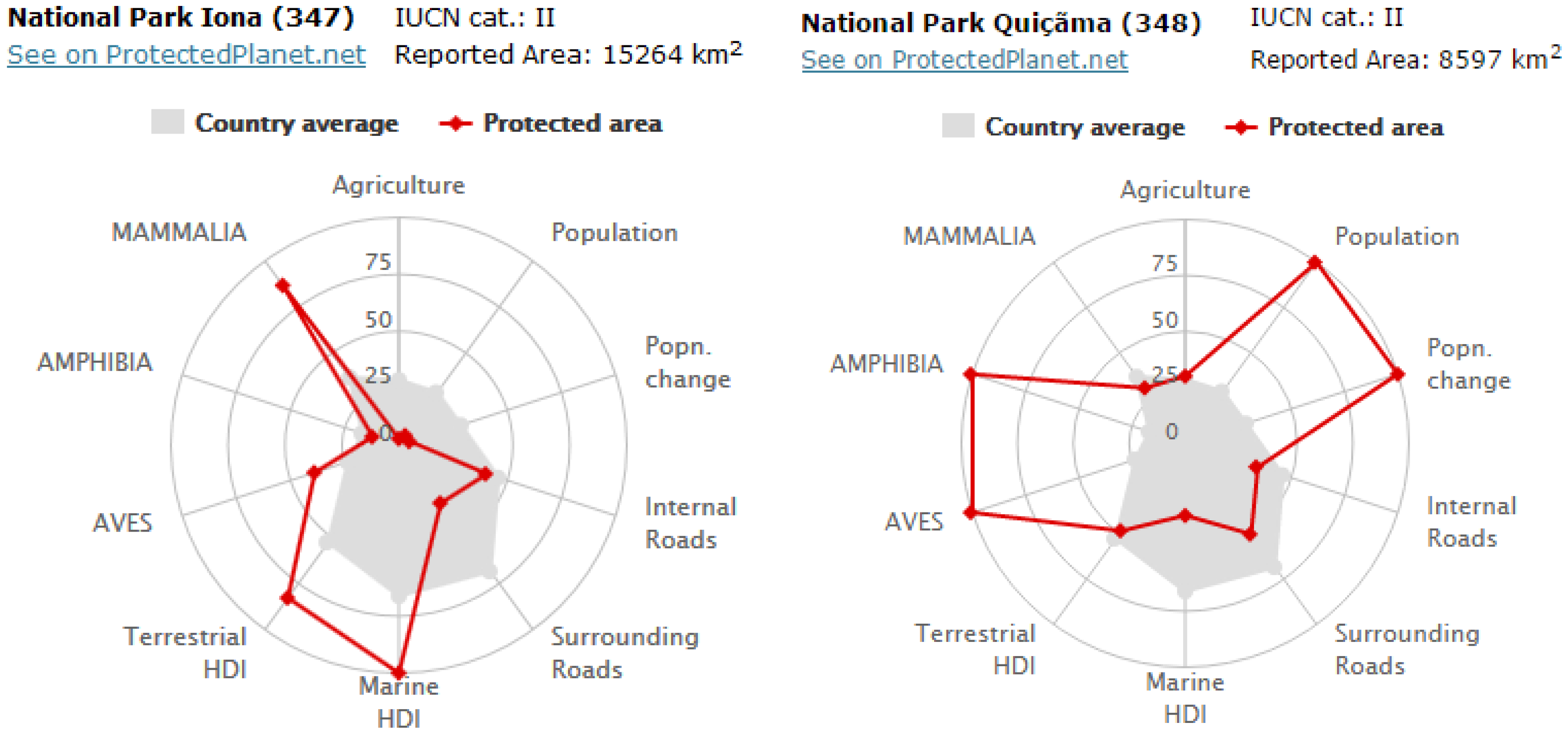 Radar plots showing ten indicators from three thematic areas (species, habitats, pressures) for two coastal national parks (Iona (left) and Quiçãma (right)) in Angola. The indicator values for the selected PA (in red) are contrasted against the average values (in grey) of the same indicators computed for all the PAs of the country. To allow comparison, each indicator has been scaled from 0 to 100, respectively corresponding to the lowest and highest indicator value found in the PAs of the country. While Quiçãma is the most important PA in the county for birds and amphibians, Iona is more important for mammals and has higher terrestrial and marine habitat diversity. Relative to other PAs in Angola, agricultural pressure is very low in Iona but medium in Quiçãma; road pressures (from within and around the area) are below average in both parks. Quiçãma is further exposed to highest population pressure while Iona has low direct pressure from the surrounding population.