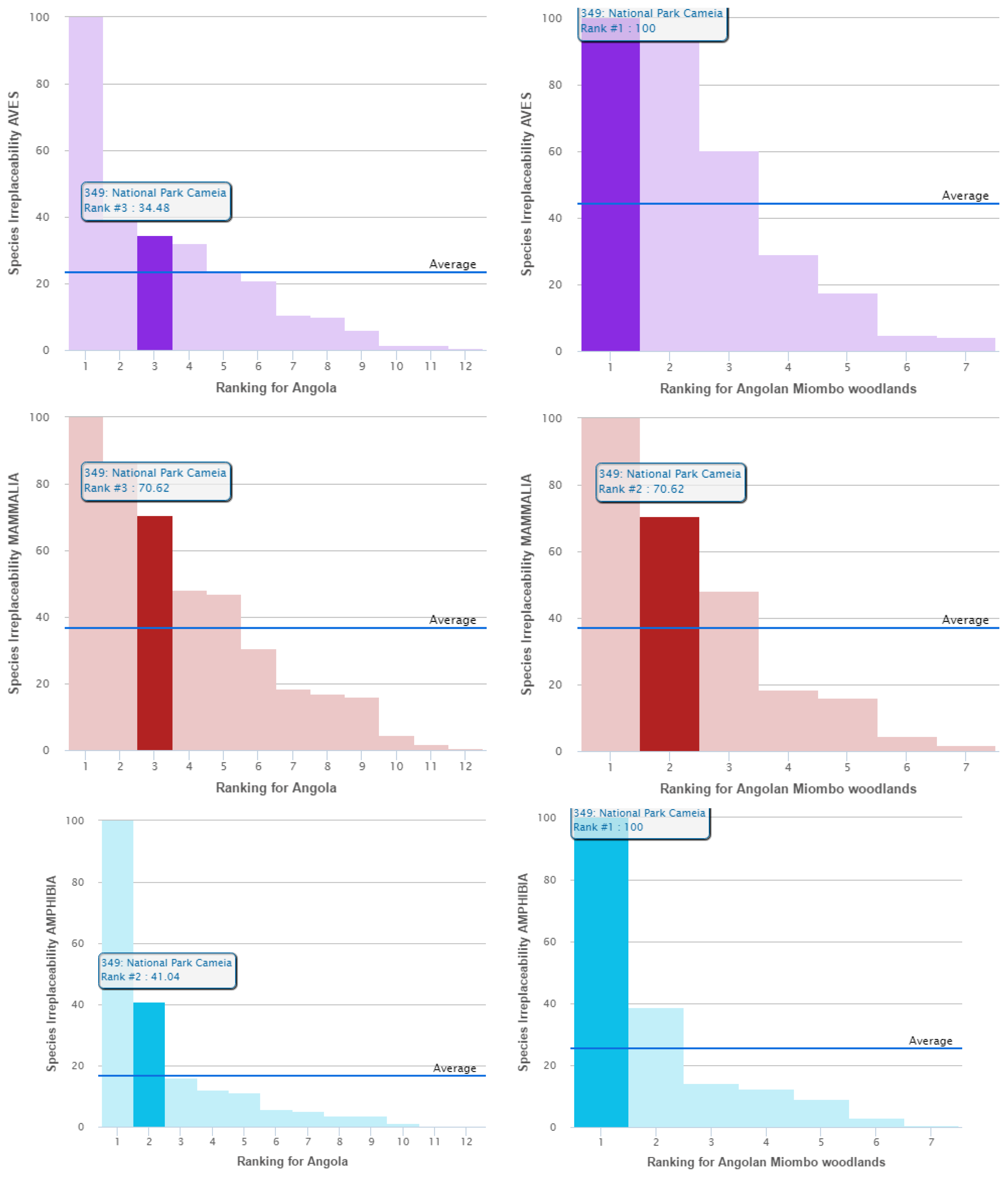 Bar charts of the relative value of the species irreplaceability for the Cameia National Park in Angola at (left) country level and (right) ecoregion level for the Angolan Miombo woodlands. Cameia ranks high on all species irreplaceability scores, and comes out as the most irreplaceable PA in the Angolan Miombo woodlands for birds and amphibians.