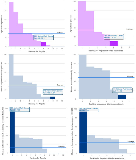 To facilitate comparisons of PAs in the same country or ecoregion, the DOPA summarizes the site level indicators in radar plots, histograms and tables at the country and/or ecoregion level. These formats are easy to use and can be particularly useful to inform decision making on potential priorities for further conservation research, action and funding. For example, in the DOPA, each PA is characterized by a radar plot showing the area’s indicator values against the country average (Figure 4), and separate histograms allow the user to compare and rank all PAs in the same country or ecoregion based on their values and pressures (Figure 5 and Figure 6). The indicator values for all PAs in a country can also be compared and downloaded in tabular format. The tables include essential context information such as the PAs’ size, IUCN Management Category [35] and whether the area is terrestrial, marine or mixed.