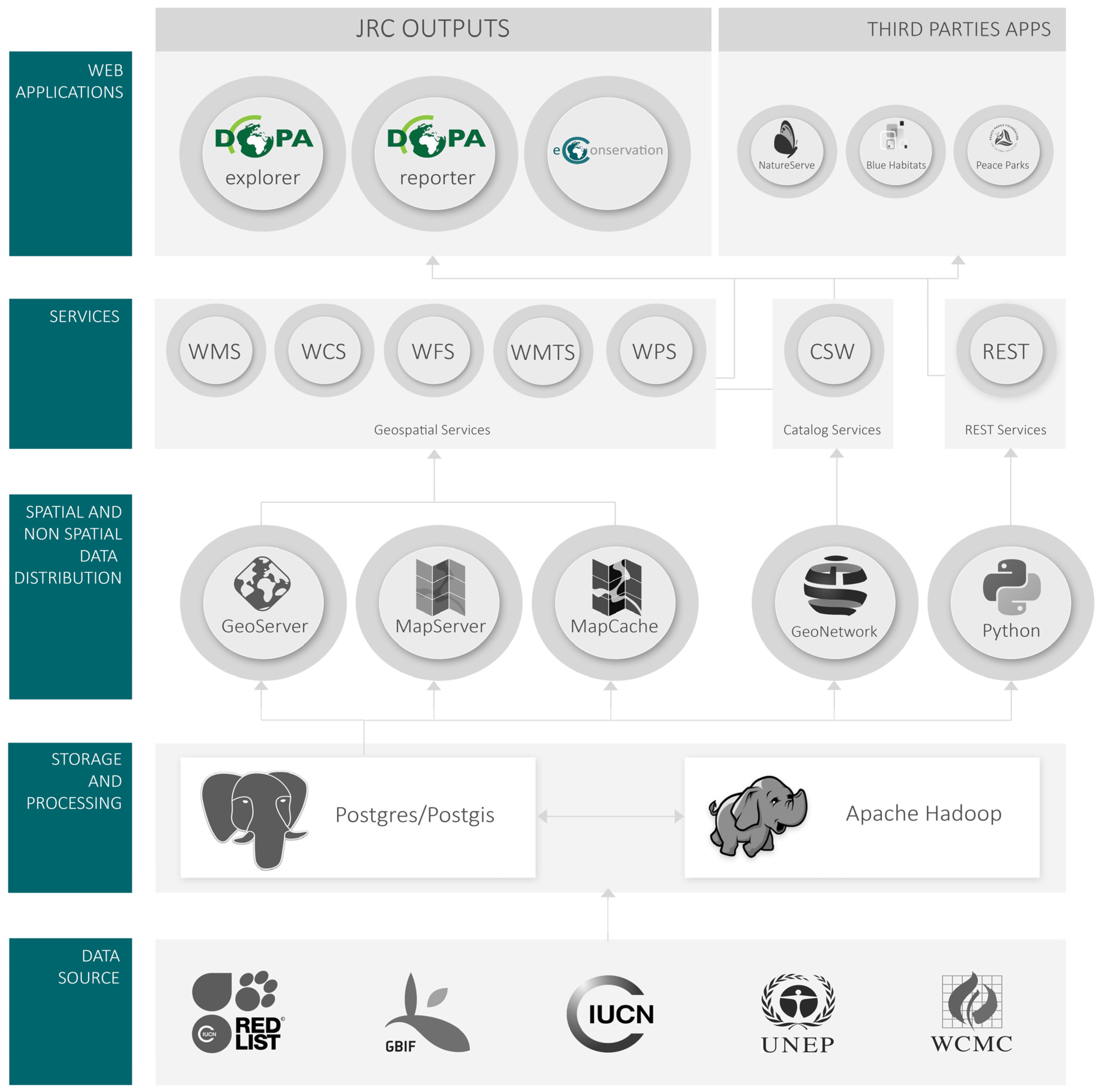The DOPA is designed to encourage a multi-scale, cross-disciplinary approach to biodiversity without being exposed to excessive risks coming from integrating data from undocumented sources and/or with undocumented uncertainties. Biodiversity and Ecosystems Services-related data are particularly difficult to manage at the global scale as the volume of information is huge and at the same time very fragmented. In the following, we will summarize the design considerations which led to the current architecture.