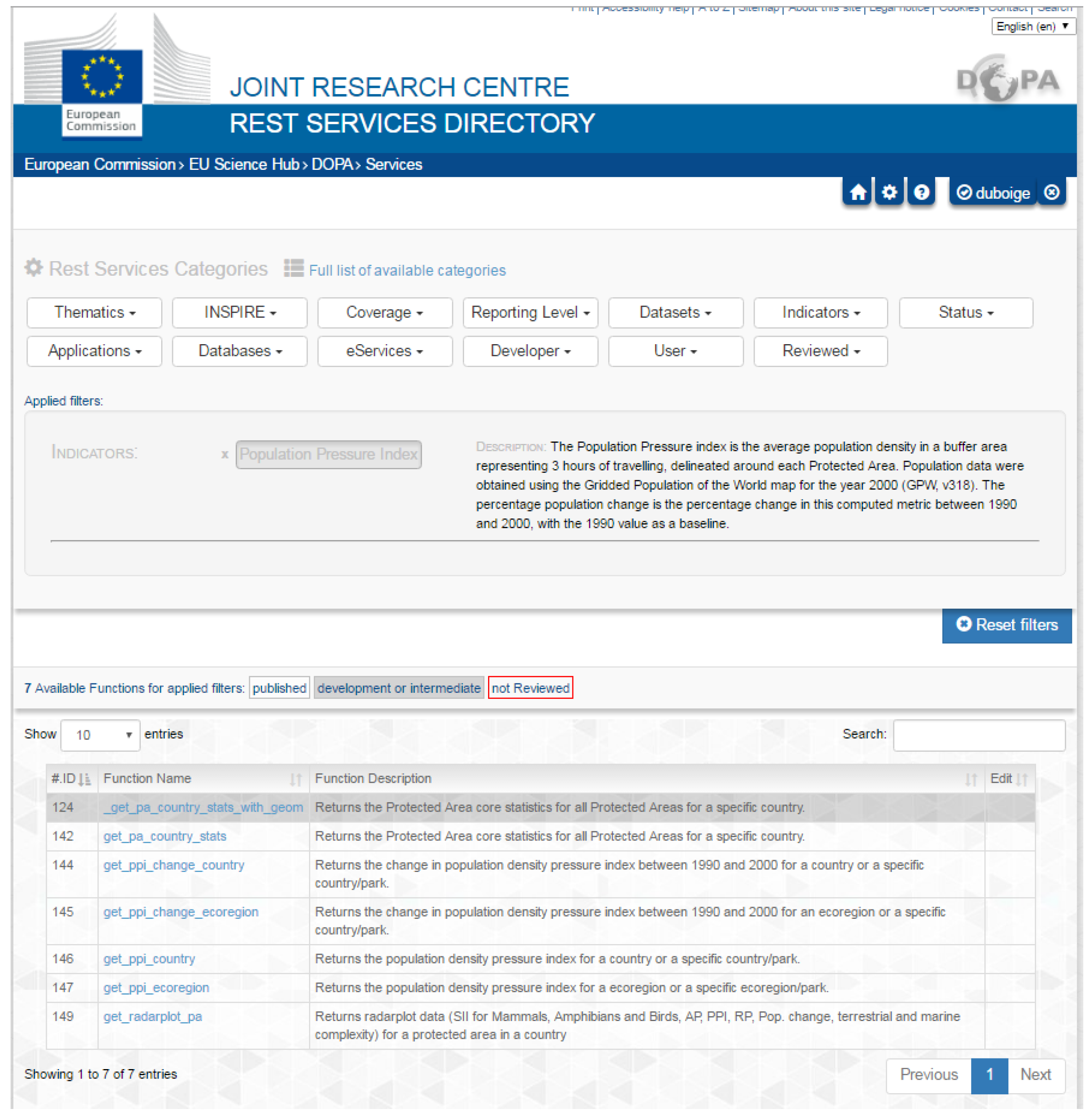 The REST services supporting the DOPA are documented through an interface allowing end-users to browse through these according to various criteria (e.g., spatial coverage, thematic, applications, etc.).