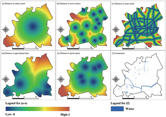 Visualization of spatial variables used in the PLS-CA model. (a) Durban; (b) Dtown; (c) Dmrd; (d) Dagri; (e) Dgs; and (f) Constraint.