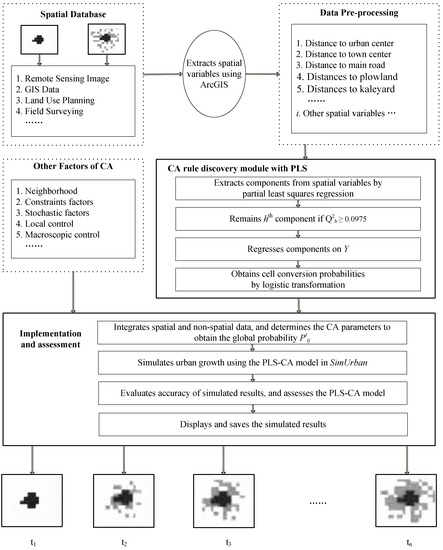 (3) CA rule discovery: This module derives uncorrelated spatial components using PLS. It determines whether the derived spatial variables satisfy the cross-validation of and, hence, it is used to define CA parameters (i.e., weights of spatial variables) by which the land conversion probability under variables can be obtained. The PLS regression was conducted using the “PLSR” package of R-language [48].