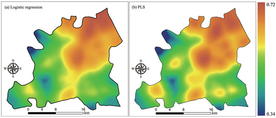 Land conversion potential based on spatial variables. (a) Logistic regression and (b) PLS.