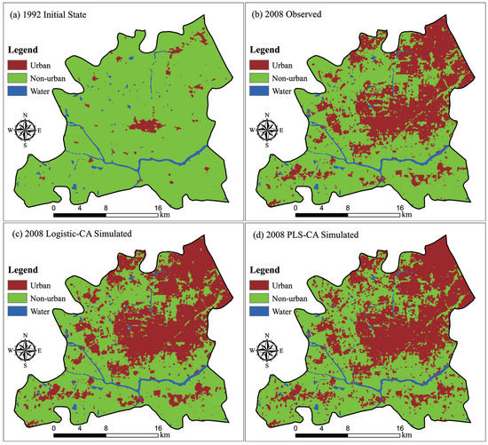 The PLS-CA model was applied to simulate urban growth of Songjiang from 1992 to 2008 (Figure 5). In the simulation, land use types were generalized as urban, non-urban, and water body.