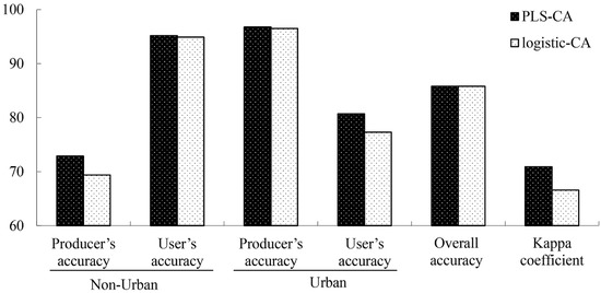 The detailed simulation accuracies were calculated for Songjiang in 2008 for the logistic-CA and PLS-CA models for Songjiang (Figure 6). The user’s accuracy for non-urban generated by the PLS-CA model was 3.5% greater than that of the logistic-CA model, and the producer’s accuracy for non-urban from the PLS-CA model was nearly equal to that of the logistic-CA model (94.9%). For the urban category, the user’s and producer’s accuracies of the logistic-CA model were 96.5% and 77.3%, respectively, lower than those of the PLS-CA model. The overall accuracy of the simulation results in 2008 was 83.5% for the logistic-CA model, 2.3% less than the new PLS-CA model. The Kappa coefficient of the PLS-CA model was 70.9%, which outperforms the logistic-CA model (66.6%). The comparison suggests that the PLS-CA model generated more accurate results compared to the logistic-CA model.