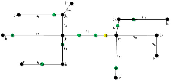 Figure 2 illustrates an example of a line graph that corresponds to the network in Figure 1. The segment is modeled as a graph node. The connecting relationship between segments and is constructed as spatial relationships .