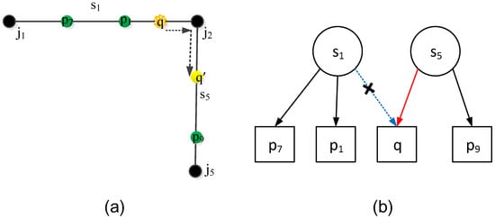 Figure 3 illustrates an example of bridgeable edges, where a query object q travels from segment to segment , as shown in Figure 3a. The edge (blue arrow line) from node to node q will be deleted, and a new edge (red arrow line) from node to node q will be created, as shown in Figure 3b.