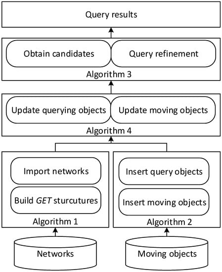 Based on the proposed data structures, the proposed LGCR query algorithm for moving objects in networks includes several algorithms for initialization, insertion, location update, filter and refinement, as shown in Figure 6.