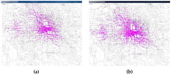 We conducted experiments on a standard personal computer with an Intel i7-4790 CPU, 8G RAM and a 1-TB mechanical hard disk. We used the generator GT-MobiSIM [42] driven by an XML configuration file to simulate moving objects, and query objects were randomly selected to issue continuous range query requests. In order to test the performance and efficiency of our proposed LGCR, we prepared two experiments. The first experiment simulated 5000 moving objects in a network and randomly selected 500 query objects to issue continuous range query requests with different range parameters, as shown in Figure 7a. The second experiment simulated 10,000 moving objects and randomly selected 1000 query objects, as shown in Figure 7b. As illustrated in the figure, the red points were moving objects, and the blue points were querying objects. The input employed real network datasets from Beijing, with 26,220 segments and 18,856 intersections. The generator included various mobility models in networks, such as random waypoint and random trip. Additionally, there were three ways to represent continuous-time traces, including the location step-function, velocity set-function and acceleration step-function. It also included various parameter distributions for moving objects, such as the Gaussian distribution and normal distribution. In experiments, we set the parameter distribution to the Gaussian distribution, and each moving object followed the shortest path to the final destination generated from a predefined random waypoint mobility model. The related data structures were implementation using the native graph database Neo4J 1.9.7. The proposed LGCR query algorithm was implemented using Java as the main programming language and Eclipse as the development environment.