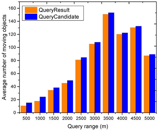 Figure 9 illustrates that the average number of moving objects in the query results (orange bar) is very close to the average number of moving objects in the candidate results (blue bar). The average utilization ratio of candidate objects retrieved by GET increased to 81.2%, that is GET effectively maintained the reusable candidate moving object for incremental continuous range queries for the LGCR query algorithm. The basic unit of GET is a road segment. Hence, the length of a road segment is related to the number of candidates. A longer road segment led to the ratio between the query results and candidate results decreasing. The average length of road segments in Beijing in the experiments was 202.25 meters, which is a relatively short distance; hence, GET maintains more accurate candidate sets.