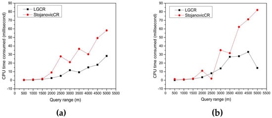 Comparison of Stojanovic continuous range (StojanovicCR) and line graph-based continuous range (LGCR). (a) The result of the experiment with 5000 moving objects and 500 query objects; (b) The result of the experiment with 10,000 moving objects and 1000 query objects.