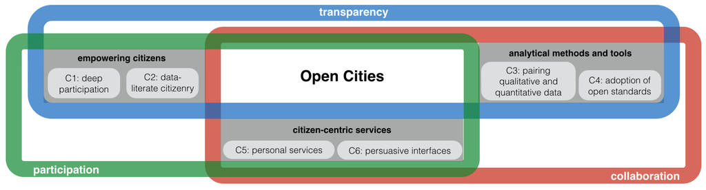 Technological progresses, the open data movement, and the trend of big data provide an environment where the risk of privacy harms related to the five aspects above-mentioned is increased. For example, Lyon [66] mentions that “big data practices are increasingly important to surveillance”, and that “in a big data context, the same data are increasingly used for different purposes”. Linked Data, which helps to describe the content and context of resources (see [67]), eases aggregation and identification. The open data movement requires increased accessibility. As a result, reducing the risk for privacy violation (e.g., by putting the citizen fully in control of the kind of information s/he would like to disclose) is, in the current context, a major challenge.Regarding GIScience, the field has focused on location privacy. As Dukham and Kulik [68] stress, “[o]ur precise location uniquely identifies us, more so than our names or even our genetic profile”. Challenges mentioned in [68] regarding location privacy include (i) understanding the techniques a hostile person might employ in order to invade another person’s privacy, and (ii) the development of truly spatiotemporal models of location privacy. - Persuasive interfaces (C6): City governments pursue novel ways to engage with citizens as to better support their needs and concerns, and to involve them in decisions that affect them. Among the existing methods for getting citizens engaged (e.g., public consultations, local meetings, etc.), the creation of persuasive interfaces is getting importance as user interfaces are seen by citizens as the only “visible interfaces” between city services and themselves. The field of persuasive interfaces is not new; it can be traced back to Tversky and Kahnemann’s pioneering work on the prospect theory about framing decisions and psychology of choice [69]. City services need to go beyond traditional interfaces to pay attention to more user-centric interfaces that stimulate and encourage change. From the point of view of GIScience, the challenge lies not so much in design and psychology (which are important aspects), but in creating new types of user experiences that facilitate opportunistic interactions with citizens [70], and present information in such a way that citizens are persuaded to change their behavior and take actions accordingly. The stakes here are high, because citizens’ behavior plays an inescapable role against today’s most pressing environmental issues in cities [71].