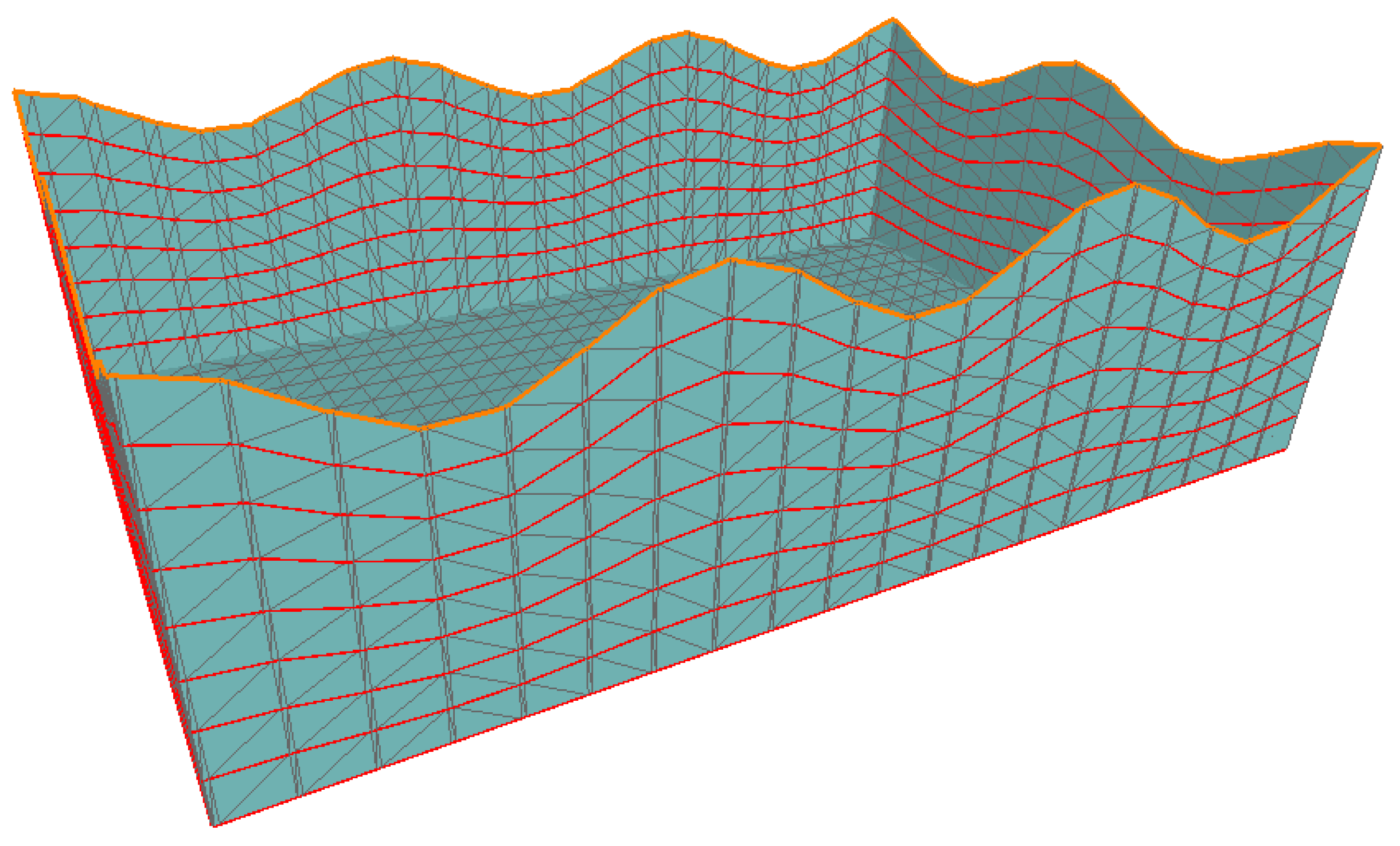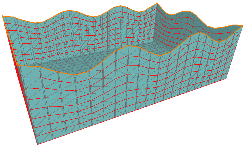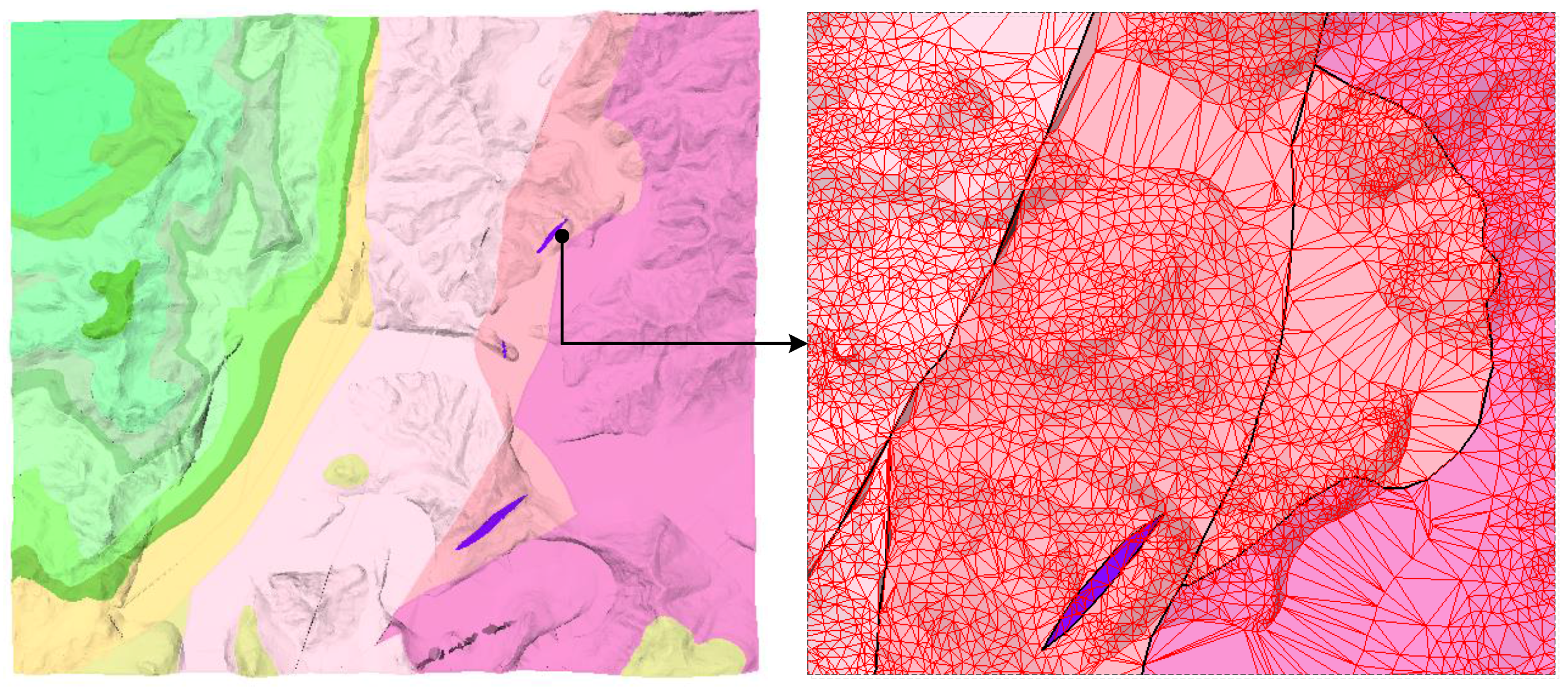- The upper surfaces were constructed from a constrained Delaunay triangulated irregular network (CD-TIN) by coupling the geological boundaries and the DEMs [39,40].
