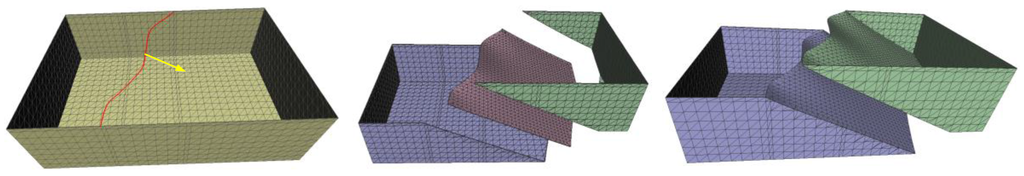 Strike-slip faults are faults whose movements are horizontal along the fault’s strike. This type of fault is very common, and the basic conditions can be represented by the geological boundaries. The boundaries on each side of the fault surface move in opposite directions along the fault. The fault surface was constructed from the attitude of the fault, and the fundamental body was divided into two models by the fault surface. The other bodies were then extracted from these two fundamental bodies. The fault model in Figure 10b and the left fault in Figure 10 are strike-slip faults.