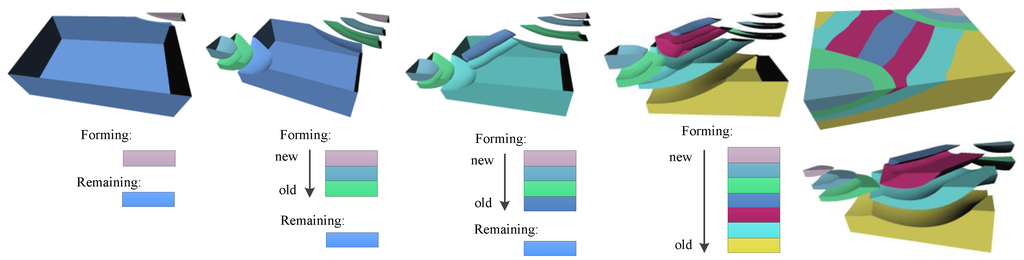 When constructing the geological models using this method, it is important to assign the orders of formation of the bodies. During the formation of geological bodies, older bodies can be eroded and new bodies can be formed on these bodies through a series of geological processes, including transportation by water and deposition. Thus, old interfaces will terminate at younger interfaces when they intersect, and younger interfaces should be used in the model construction before older interfaces are used. Therefore, every time an interface divided a fundamental body, only one Boolean operation was used. The workflow is shown in Figure 5.