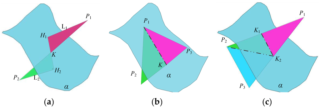 When one segment of a triangle intersected the surface and another point’s function value was zero, the triangle was divided into two triangles with one in the surface’s positive field and one in the negative field. As shown in Figure 6b, where f(P1) = 0, f(P2) < 0 and f(P3) > 0, the triangle was divided into △P1KP3 and △P1KP2; △P1KP3 was in the positive field, and △P1KP2 was in the negative field.