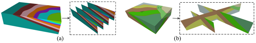 Strata are usually the simplest and most fundamental geological structures, and they are usually formed by deposition. If the deposition was not interrupted, the strata may be parallel to each other; these are called conformable strata. Correspondingly, when the deposition was interrupted by the geological process and the strata formed by the next deposition are not parallel to the previous one, the strata are referred to as unconformable. These two types of strata were simulated through the workflow in this paper. Following a sequence from new strata to old strata, each stratum was extracted from the fundamental model. The conformable strata are simulated in Figure 7a; the sections perpendicular to the strata were created. The unconformable strata are simulated in Figure 7b; the cross-sections shown on the left describe the conformable parts, and the unconformable parts are described on the right.