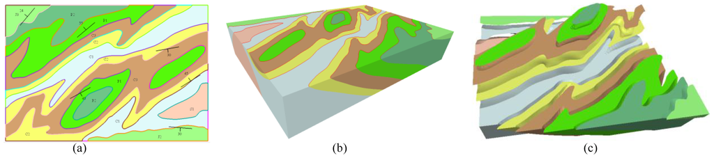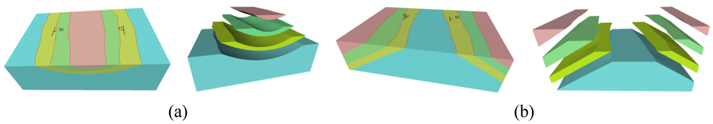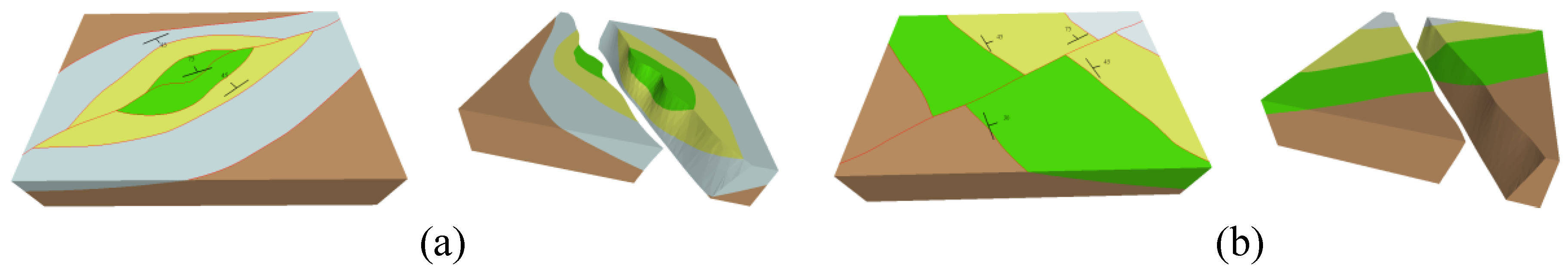 Synclines are good structures for water storage and are suitable for constructing reservoirs. Thus, simulating synclines is necessary before planning this type of infrastructure. The interfaces were constructed from the HRBF surface in the subsurface by connecting the same boundaries on both limbs of the syncline. The geological bodies were constructed from the interfaces one by one from the center to the limbs. The model in Figure 8a is a simple simulation of a syncline. The structures in the middle of the models in Figure 8 are simulated synclines from geological maps.