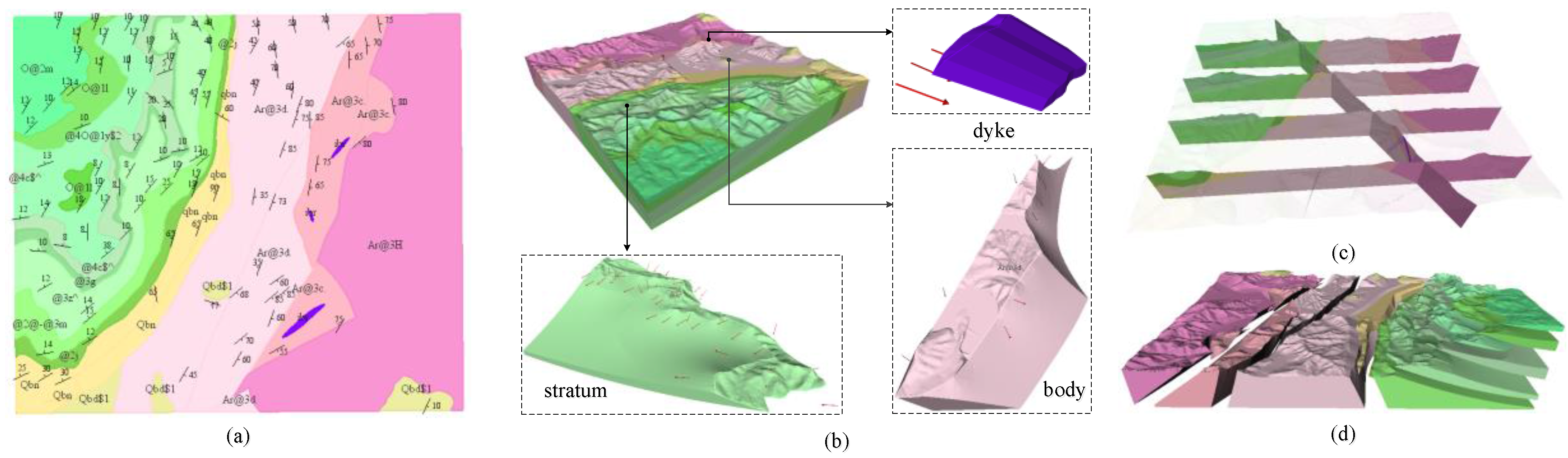 Geological maps are the most important results of geological surveys. To satisfy the demand for the representation of deep geological information, it is usually necessary to extend single-layer 2D maps to 3D models [15]. In contrast to typical engineering objects, the complex geometries and topologies and the scale dependency and hierarchical relationships involved in such work make traditional CAD systems unsuitable for complex geological modeling. Thus, there is an urgent need to develop specific geological modeling systems that can be used to create geological models [16,17].